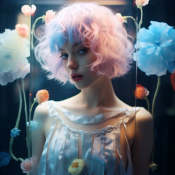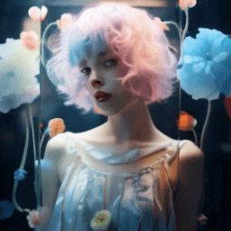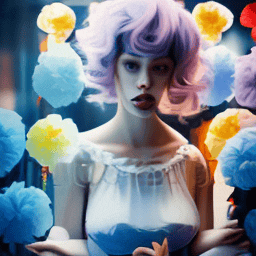 A cute Alice model is portrayed wearing a blue dress with a bored expression against a pink background.