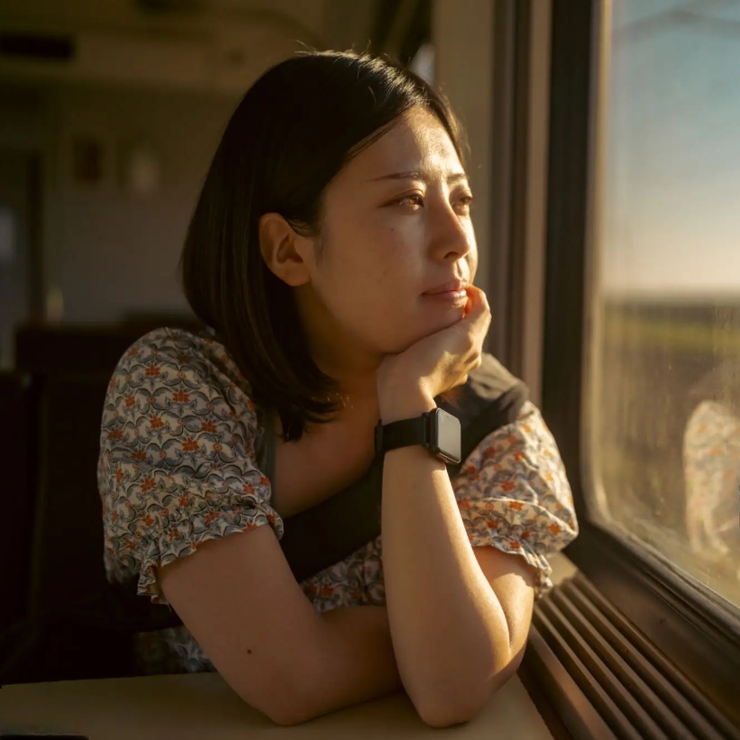 A tall man with soft features wearing a light-colored sweater stands in the middle of an empty train station platform during golden hour in autumn.